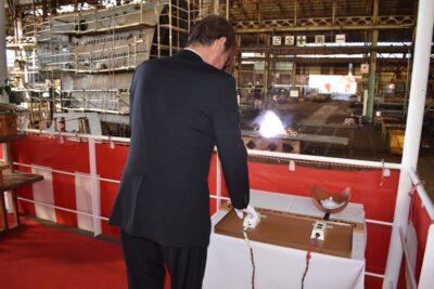 令和7年10月10日 HOSEI GLOBAL NAVIGATION S.A. 様ご発注のS721番船 13,500DWT GENERAL CARGO船の進水作業を行いました。